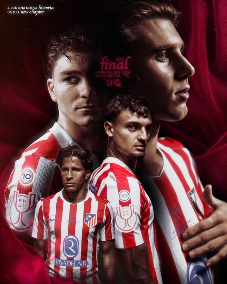 马竞官方社媒发布国王杯决赛海报,阿尔瓦雷斯、普比尔、巴里奥斯、朱利亚诺·西蒙尼出镜